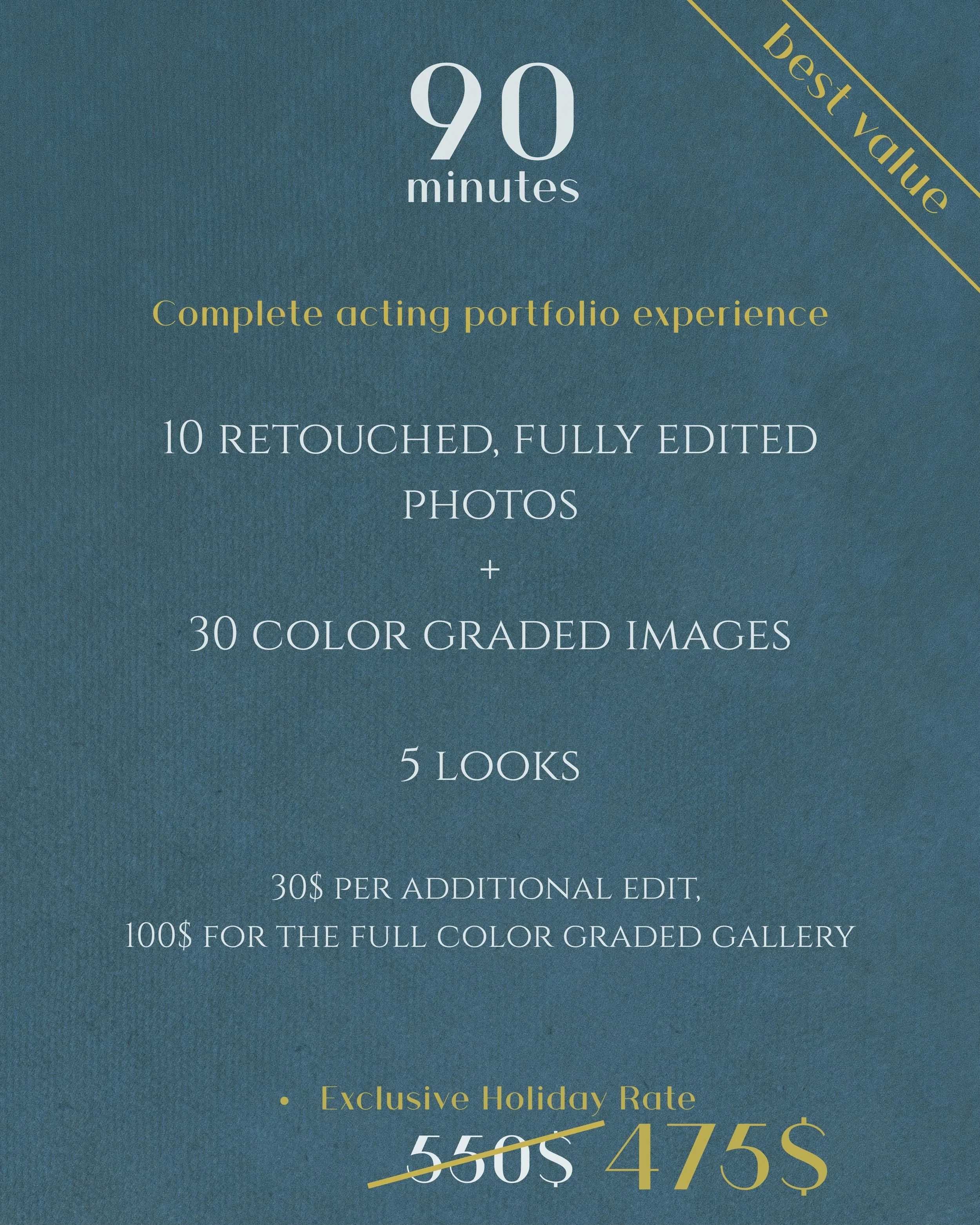 Short, dynamic, and efficient — ideal for actors who need fast results without sacrificing quality. We’ll get right into the flow and capture your best, most authentic self.